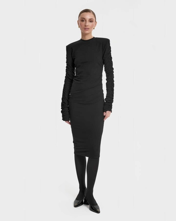 OPR-YARA-BLKYara midi dress escapes the patterns. Made of stretch knit fabric (viscose with elastane), it is more than just a garment - it is a form that adapts to you. Its subtle creases on the sleeves and sides not only add character, but also gently sculpt the silhouette, emphasizing its natural beauty. Cushions on the shoulders subtly balance the proportions, giving the whole a touch of nonchalant elegance.