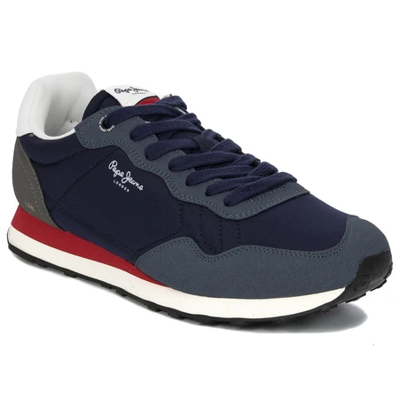 PMS30945-595Sneakers, men's shoes in navy blue - Navy with a white and red accent by Pepe Jeans from the Natch Male line are a timeless choice. The upper is made of fabric and natural leather with a flat sole 3 cm high made of high-quality material. The interior is made of fabric, and the insole is made of high-quality material. If you like universal and classic cuts, this model is for you. The Pepe Jeans London brand logo is placed on the side outer part of the upper, on the insole and on the tongue. Model with a round toe tied with classic laces. In these shoes you will surely feel incredible lightness, comfort and they will remain an inseparable element of your wardrobe.