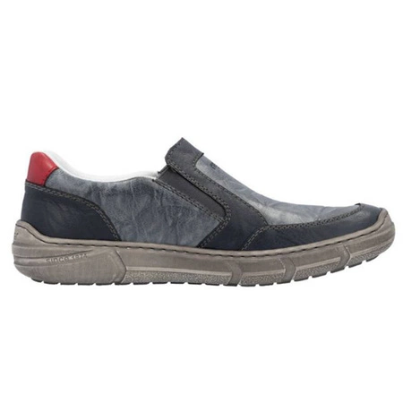 04052-12Introducing men's slip-on shoes from Rieker brand.The upper of these shoes is made of natural leather in Blue Blue.The interior is made of organic leather, and the insole is made of natural leather.The model with elastic rubber inserts makes it easy to put on and take off.The shoes have a flat sole with a height of 3 cm and a round toe.They are ideal for both work and social gatherings, for those who appreciate a modest, classic and elegant style.