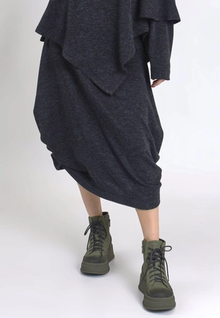 The Silvia Grafit knitted skirt by Maciejka is something that will surely appeal to many customers. Made of very pleasant to the touch, soft, flowing fabric. The ruffles on the sides give the model an interesting cut and at the same time perfectly mask any figure flaws. A comfortable wide elastic band at the waist perfectly stabilizes the skirt on the figure and allows for great freedom. Available in four sizes from "S" to "XL". It fits beautifully with other Maciejka products, including blouses and ponchos.