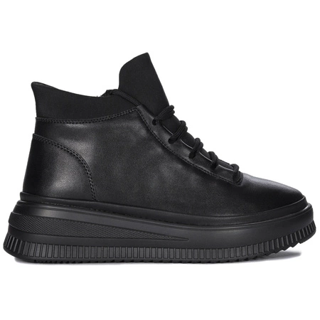 55C1041From the latest collection of the Artiker brand we recommend comfortable and stylish women's platform boots. The upper is made of natural grain leather in an elegant black color. The sole is a platform, fashionable in every season. The interior is insulated, and the insole is made of fabric. The practical side zipper makes it easy to put on and take off the shoes, and the laces give the possibility of a perfect fit to the foot. The whole is set on a 3 cm high platform in front with a 4.5 cm high heel, which is perfect for icy roads, providing ideal traction. Tensity: G. Quality: I.