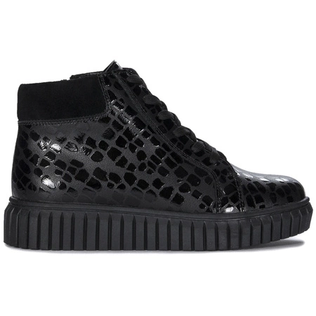 DBT6368/24 BKFilippo is a brand whose collections are designed for classy women, who care about always looking perfect regardless of the occasion. We present the latest model of women's boots from this brand. The upper was made of high-quality natural grain leather in black, covered with a lacquered print in centers. The round toe gives the toes a lot of freedom and allows for comfortable positioning. The side zipper makes it easy to change shoes, and thanks to the laces you can adjust the upper to suit your needs. The interior and insole are made of soft and warm fleece. The model on a platform with a height of 2.5 cm in the front and 3.5 cm in the back. They will perfectly complement many original stylizations. Quality: I. Tensity specified by the manufacturer - G.