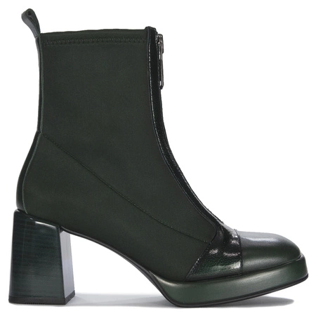 HI243658 C012Comfortable women's boots by Hispanitas, are an absolute must have in the closet of every distinguished woman. Their original design fits perfectly into today's fashion canons. The model was made from a combination of elastic stretch and natural grain and patent leather, all in a beautiful dark green color - Forest. The upper at the front fastens with a long zipper. Such a solution is extremely helpful when changing shoes. The interior of the shoe is made of leather and thick slightly insulated fabric. The insole is ecological leather. The front part of the shoe uses a platform of 2 cm in height. The heel, on the other hand, is an 8 cm post. The square tip further improves toe comfort. Made in Spain.