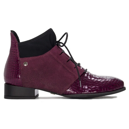 04744-48/00-7Maciejka is a Polish brand that produces women's shoes. The brand's shoes are made of the highest quality natural leather, which guarantees comfort, convenience and versatility. The models produced by the Maciejka brand are in line with the latest trends, while also remaining within the classic stylistic framework. The company's priority is customer satisfaction, and here is a model that meets all these criteria. The upper is made of natural suede leather, patent leather with a reptile motif in shades of burgundy and plum, and elastic black fabric. The asymmetrical upper part of the upper creates an interesting shape. The sole is a flexible, high-quality material with a stable, flat, square heel, which significantly increases the comfort of use. The interior and insert are fabric. Lacing on the front of the upper will allow the shoes to fit perfectly to the foot. High comfort of use combined with an attractive appearance is a characteristic feature of these shoes. So if you value comfort and originality, this pattern is for you.