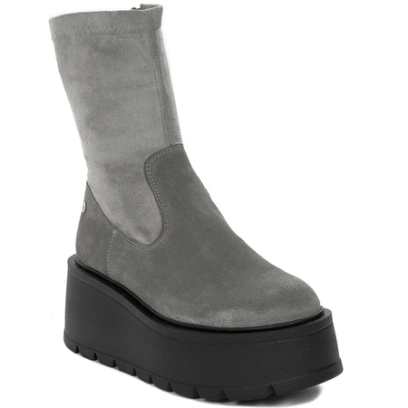 05319-03/00-7The presented women's boots of the Polish brand Maciejka are made of natural velor leather and gray fabric. The boots have a very interestingly cut upper. The toe of the shoe is round in shape. The practical zipper closure on the inside of the shoe makes it quick and easy to put on and take off. The interior and the insole are padded with a pleasant to the touch, soft, slightly insulated fabric. The whole is based on a platform sole made of high-quality material with a height of 7 cm. The height of the sole at the front is 5 cm. Extremely stylish and elegant boots will make every day more pleasant and will perfectly complement many stylizations. Quality: I. Country of production: Poland.