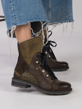 3623A-24/00-5Maciejka is a brand whose experience and awareness of customer needs make each model of footwear unique. To meet the expectations of customers, manufacturers offer innovative styles made of high-quality leather. Women's boots, made of natural leather in olive color, intended for the autumn and winter season, are another of the many timeless proposals of this manufacturer. The combination of different leathers: full-grain and velor with interesting patterns and fashionable shading adds character to the shoes. The interior and the insole are insulated, which protects our feet from the cold. Fastened from the inside with a comfortable zipper, they additionally have a binding at the front, which allows you to adjust the width of the upper depending on your needs. The sole is a high-quality material that perfectly insulates the feet from the ground, protecting them from moisture. The top of the upper is decorated with round, silver balls. Beautiful, fashionable and comfortable are the features of this model. They are perfect for many styles from trousers to dresses.