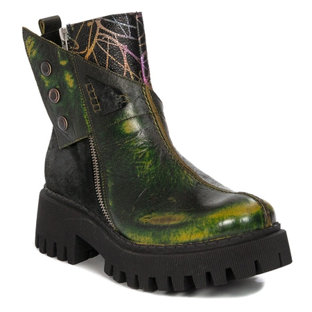06140-01-00-7The latest offer from the Maciejka brand - original leather boots on the platform. The upper is made of a combination of black nubuck leather and patterned grain leather in shades of green and yellow. The slightly insulated interior trimmed with a pleasant to the touch fabric and a comfortable, soft insole give a sense of convenience and comfort. Sliders placed on both sides of the upper allow you to change shoes conveniently. On the outside of the upper, there is a small, decorative flap with three press studs. The sole in the form of a platform with a height of 2.5 cm under the toes and a square heel with a height of 5 cm perfectly insulates the feet from the ground and is non-slip. The round toe gives the fingers a lot of freedom and allows them to be placed comfortably. This model is the perfect addition to both dresses, skirts and trousers or leggings. It has a beautiful modern design, and its additional advantage is incredible comfort. See for yourself and order today :)