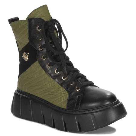 06751-01/00-8We present the latest model of women's ankle boots from the Polish brand Maciejka, equipped with a flat platform. The upper combines natural leather in a classic black color with a green, warm fabric. The inside of the shoes is padded with a pleasant, insulated material, and the soft insole guarantees comfort when wearing. The zipper placed on the inside facilitates quick putting on, and the laces allow for a perfect fit of the shoes to the foot. The sole made of high-quality plastic provides effective protection against cold, which makes these boots an excellent choice for colder days. The round nose provides comfort for the fingers, and the whole is distinguished by a modern and unique design.