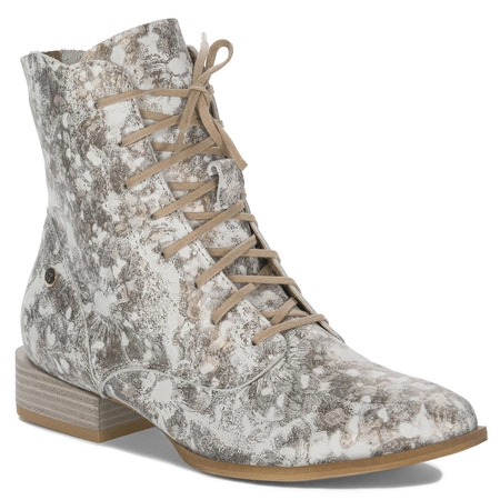 06391-25/00-0Stylish and unique, these Maciejka women’s ankle boots combine comfort, elegance, and an eye-catching design. Made from high-quality natural leather, they feature a distinctive marbled pattern in beige and brown tones, adding an artistic flair. Classic lace-up fastening ensures a perfect fit, while the stable mid-height heel guarantees all-day comfort.