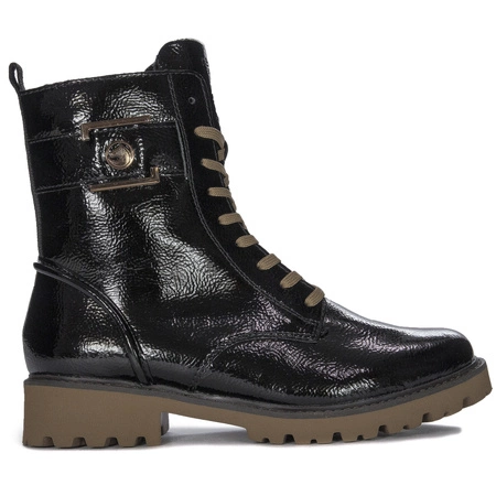 D8663-00We present women's boots from the German brand Remonte. This model is made of top quality patent leather in black “Black” color. The interior and insole is a soft and pleasant to the touch fabric - fleece, which perfectly protects the feet from the cold. The upper is laced, so you can adjust the shoe's tautness to your needs, additionally equipped with a zipper on the inside of the upper, which will speed up the change of shoes. The round toe gives the toes a lot of comfort and freedom. Model on a low trapper sole. Very fashionable, incredibly comfortable, they will perfectly complement your daily look.