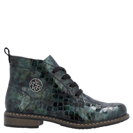 71205-90-BLUEThe latest offering from Rieker is an extremely comfortable pair of women's insulated boots. The upper is made of eco-leather with high-quality material in a multicolor design. The interior of these boots is lined with synthetic sheepskin, which keeps your feet comfortable and warm during winter days. The removable insole is made of fabric. The round toe allows for comfortable positioning of the toes. The model is fastened with a zipper located on the inside of the upper. Additionally, it can be laced up, allowing you to adjust the upper to the width of your foot. The platform sole is 3.5 cm high at the back and 1 cm at the front. It is very stable and provides a feeling of comfort and convenience. This model goes well with many styles. Perfect for everyday wear.