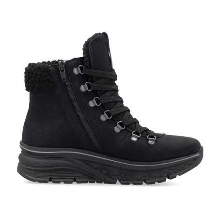 48034-00The latest offering from Rieker is an extremely comfortable women's insulated boots. The upper was made of nubuck-like eco leather in black “Black” color. The interior of these boots is synthetic sheepskin, which provides feet with comfort and warmth during winter days. The insole, which is removable, is made of fabric. The round toe allows for comfortable placement of the toes. The model is fastened with a zipper located on the inner side of the upper. In addition, it has the possibility of lacing, so you can adjust the upper to the tenacity of the foot. The sole with a 5 cm high heel, has a height of 3 cm at the front, is very stable, gives a sense of comfort and convenience. This model is suitable for many styling. Perfect for everyday wear.