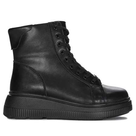 TS Z24-223 BLKWomen's boots by T. Sokolski are an original and very comfortable proposal for the coming winter. The upper is made of natural grain leather in black “BLK” color. The insole and interior is a warm and pleasant to the touch synthetic sheepskin. The sole, is a well-shaped platform produced from high-quality plastic, which is 4 cm high at the back and about 2.5 cm high at the front, thanks to which it perfectly insulates the feet from the ground. The upper is equipped with a side zipper, which will improve the changing of shoes. Thanks to the laces, you can customize the sockliner to your needs and preferences. Ideal shoes for ladies who appreciate fashionable design combined with comfort and convenience. Quality: I. Tensity: G.