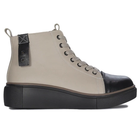 TS Z24-218 BEIG BLWomen's boots by T. Sokolski are an original and very comfortable proposal for the coming winter. The upper is made of natural grain leather in beige/black “BEIGE/ BLACK” color. The insole and interior is a warm and pleasant to the touch fleece. The sole is a platform made of high-quality plastic, which is 4.5 cm high at the back and about 2.5 cm high at the front, thanks to which it perfectly insulates the feet from the ground. The upper is equipped with a side zipper on the inside , which will improve the changing of shoes. Thanks to the lacing, you can adjust the size to your needs and preferences. Ideal shoes for ladies who appreciate fashionable design combined with comfort and convenience. Tensity: G. Quality: I.