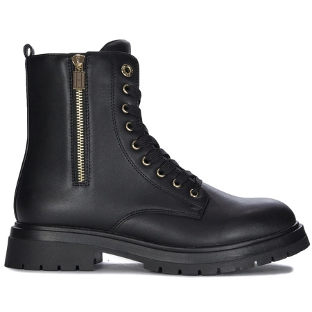 T3A5-33567-1351999 999-/BLACKClassic boots by Tommy Hilfiger, which combine fashionable style and comfort. The upper is made of black high-quality plastic. The interior of the boots is a soft, slightly insulated fabric. The solid trapper sole made of high-quality plastic ensures adequate support for the feet and reduces fatigue during a long walk. This model is equipped with lacesadao and two zippers, the outer one of which is only a decoration. These boots are very versatile and fit into many different styles.