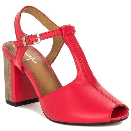 The Polish Maciejka brand has enriched its collection with another model of shoes with cut-out toes and a free heel. The upper is made of natural grain leather in red raspberry color. Cut-out provides our feet with a lot of freedom and optimal temperature in even the hottest days. The lining and insole is also made of natural leather. The clasp on the rectangular buckle in gold allows you to freely adjust the width depending on your needs and makes it easier to put on and take off your shoes. Sole and original, wood-like heel in the shape of a pole made of high-quality plastic are comfortable and give a great sense of comfort. For each pair, spare, replaceable flecks. If you want to add the originality and modernity styling, this model is for you.