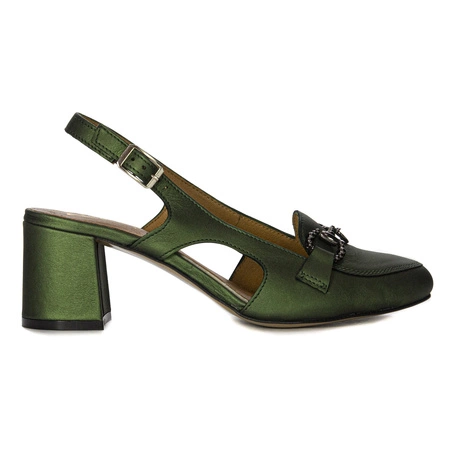 06419-09/00-1Maciejka is a Polish footwear company with many years of experience in the production of women's footwear. Among other manufacturers, it is undoubtedly distinguished by the quality of materials used. Natural leathers very soft, delicate, but also very durable. Thanks to this, each shoe is solidly made and guarantees high comfort of use. Extremely original and eye-catching pumps by Maciejka are another timeless proposal of this brand for the spring and summer season. The upper was made of soft natural grain leather in a beautiful metallic green color. The fancy shape of the upper with cutouts on both sides and a strap with an adjustable buckle on the ankle makes this model more feminine. An additional decoration of this model is a pendant with a crystal. The round, slightly almond-shaped nose, despite its rather narrow shape, allows the toes to position themselves freely. The heel in these pumps is open. The interior is also natural leather. Soft leather insole provides maximum comfort. Very elegant, for classy women who like to attract attention. Manufactured in Poland. Quality: I.