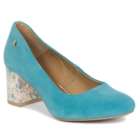 03356-51/00-1Maciejka women's pumps in light blue are an elegant and feminine proposition for spring and summer 2025. Made of high-quality natural leather and suede, these shoes combine subtle aesthetics with comfort. The model is characterized by a closed almond-shaped toe and a slim 6 cm high heel in the form of a post, which ensures stability and an elegant look. The pumps are perfect for any occasion, from formal meetings to evening outings, perfectly matching various styles. The beige color of the heel with a decorative motif makes these shoes stand out with delicacy and elegance. The model in the standard width "F 1/2" is intended for people with a normal foot width, providing comfort all day long. These pumps are a combination of classic and modern style, which will surely become a favorite element of your wardrobe.