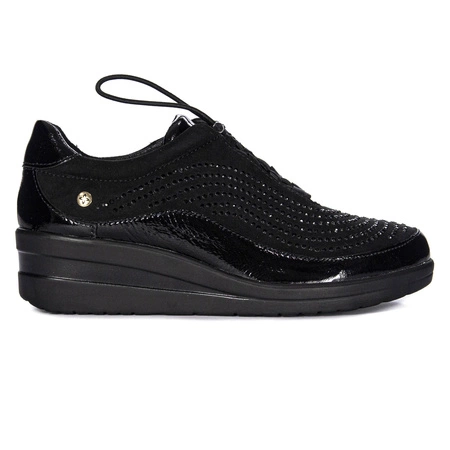 P2124-01/00-7The latest women's shoes from the autumn/winter collection from the Maciejka brand are an original proposal for women who appreciate unique style and comfort. The upper is made of natural velour and varnished leather in black, adjusting to the foot thanks to elastic laces with a stopper. The interior of the shoes is made of fabric and natural leather, and the insole is natural leather. The round tip provides freedom to the toes, making every step comfortable. The sole made of durable plastic is 4.5 cm in height at the heel and 2 cm at the front. The model goes well with everyday styling. Quality I.