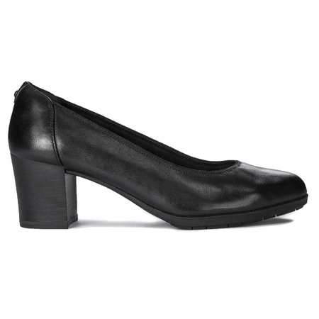 22416-43 001The presented model from the Tamaris brand is a classic, black pumps made of natural leather. The round, gently almond nose adds a unique elegance to them. The inside of the shoes is finished with a soft fabric, providing comfort. Leather insert, profiled and glued with soft foam, guarantees great comfort. A stable post-shaped heel provides solid support for the entire figure. The beautiful line of the upper along with the heel optically slims the legs, adding elegance to the styling. Perfect to wear in the office, as well as for evening outings.