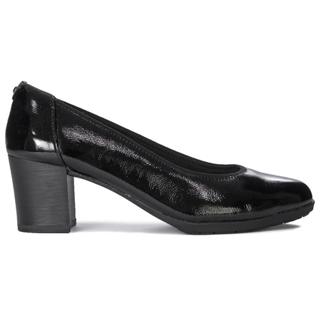 22416-43 018The presented model from the Tamaris brand is a classic black pumps made of natural patent leather. The round, slightly almond-shaped nose adds to their unique elegance. The interior of the shoes is finished with soft fabric and ecological leather for comfort. The insole made of natural and ecological leather, profiled and lined with soft foam, guarantees great comfort. The stable 6 cm high post-shaped heel provides solid support for the entire silhouette. The beautiful line of the upper together with the heel optically slenderizes the legs, adding elegance to the styling. Ideal for wearing in the office, as well as for evening outings.