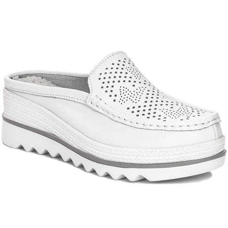 46C2850The latest proposal from the Artiker brand is an absolute must in a woman's wardrobe. Unusual and eye-catching slippers made of very soft natural leather in white. The front made in an openwork style gives the shoes a light character, but also provides our feet with an optimal temperature. The interior and the insole are also foot-friendly natural leather, which gives a great sense of comfort. The model is supported on a platform made of high-quality material, 2.5 cm high in the lowest place, i.e. under the toes, and 5 cm in the highest, under the heel. Incredibly light and very comfortable, they are the perfect complement to a woman's outfit.