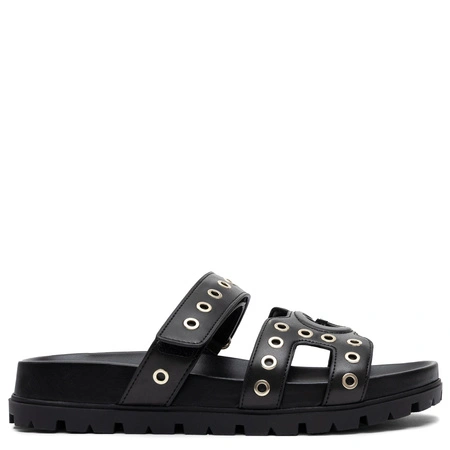 Monochrome minimal: pair the slides with a black T-shirt dress and a crossbody with a chain strap. Let the grommets echo your jewelry and keep the rest clean for a sleek summer uniform.