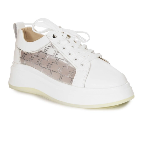 54C1901We present women's sneakers by Artiker. They were made of top quality natural leather in an elegant white color. The interior and insole are also made of natural leather. In addition, the sides of the shoes are made of airy mesh, increasing airflow. The sole of the shoe is made of high-quality plastic, which provides not only comfort and durability, but also cushioning when walking. The shoes were made on a 5 cm platform. Laces allow the shoe to fit any foot and make it easy to put on and take off.
