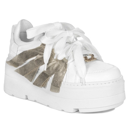 Women's half-shoes, platform sneakers by the Polish brand Eksbut. The upper in white is made of top quality natural leather, which will provide you with comfort and durability for a long time. The interior and insole are also made of natural leather, which will provide you with even more comfort and protection for your feet. The sole of the shoes is a platform with a height of 7 cm, which will add a few centimeters to your height and make your silhouette look slim and shapely. The sole at the front is 5 cm, so your feet will be stable and won't get tired even after wearing the shoes all day. The shoes are laced, which allows you to easily and quickly adjust them to your foot. The sides of the upper are decorated with beautiful gold leather straps. Don't delay and order today these unique women's leather sneakers on a massive platform, which are both stylish and comfortable.