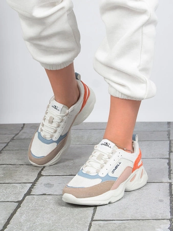 90221006.02ASneakers, low shoes for women on the platform of the renowned American brand O'NEILL of Californian origin. The top is made of "Off White" tannin with colored elements of natural and ecological leather. The interior and the insole are made of fabric. Practical laces allow for a perfect fit of the footwear to the feet. The sole made of high-quality material is a thick and quite solid platform, it is 4 centimeters high under the heel and 3 cm in front. Great shoes for the spring-summer season. They will perfectly complement many women's stylizations. Light, comfortable and practical. Sneakers are popular and adored shoes all over the world. Perfect for everyday use.