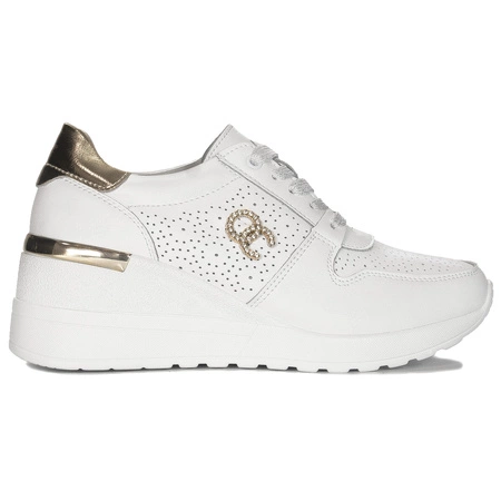 LR810 WHITE/GOLDFashionable women's half shoes sneakers by S.Barski. Our latest collection of half shoes is the perfect choice for women who appreciate comfort and style. Made of the highest quality leather-like material in white and gold, these half shoes are a combination of elegance and comfort. One of the greatest assets of our shoes are the openwork patterns on the sides and front of the shoe, as well as the application with zircons, which add to its original character. In addition, comfortable lacing allows for a perfect fit to the foot, providing full comfort during use. The interior of the shoes is finished with ecological leather, and the insole is made of soft natural leather, which ensures maximum comfort and convenience during wear. The high-quality plastic sole on the platform has a height of 5.5 cm in the heel, which adds elegance and sensuality to the silhouette. D&A sneakers are the perfect footwear for special occasions, as well as for everyday wear. If you are looking for half shoes that combine style and comfort, then our shoes are the perfect choice for you. Quality: I. Tensity: G.