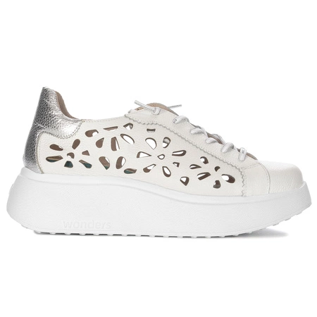 A-3621-MAX-PLATAThe white Wonders women's platform sneakers combine elegance with everyday comfort. Made from high-quality natural leather, they offer durability and a luxurious feel. The stylish cut-out design adds breathability, making them perfect for warm days. With a 5 cm platform sole, these shoes provide stability and a subtle height boost. The elastic laces ensure a secure fit, allowing for effortless all-day wear.