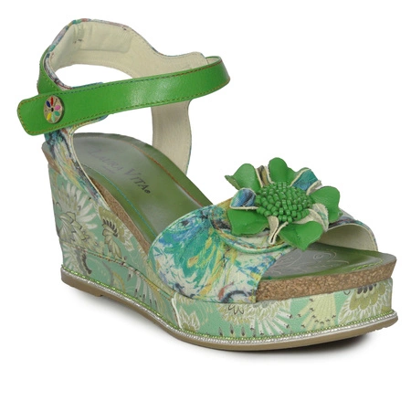 SL14598-9DWomen's sandals on platforms are the latest design from French brand Laura Vita. They were made of high-quality natural leather with a green floral pattern. The model is fastened with a single Velcro strap. The interior and insole are also made of natural leather for increased comfort. The heel of the type koturn has a height of 8 cm, is stable and slenderizes the silhouette in an elegant way. Classics in summer and spring edition.