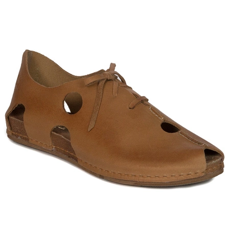 Leather women's sandals with a delicate toe cutout by Maciejka are a design that is sure to attract attention. The upper was sewn from natural grain leather in brown color. The natural leather insole and fabric interior provide comfort and convenience. Numerous cut-outs in the form of small wheels provide our feet with optimal temperature on even the hottest days. Lacing allows to adjust the soft leather of the shoe perfectly to our foot. This cut works absolutely in all situations and remains number one in terms of style and comfort. Made in Poland. Quality: I.