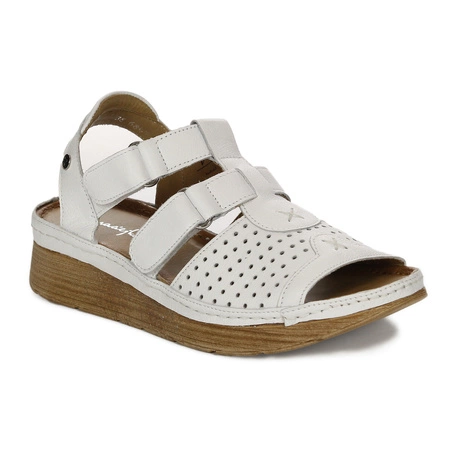 L6847-11/00-1Maciejka Women's Sandals in classic white are a perfect choice for warm days of the SPRING-SUMMER 2025 season. Made of natural leather, they provide comfort, durability and breathability, thanks to which the feet remain fresh all day long. The open toe and round shape of the shoes give a sense of freedom and lightness. The flat sole and adjustable Velcro closure allow for a perfect fit to the foot, guaranteeing comfort at every step. The shoes are perfect for everyday styling, and their universal design means they can be worn with both dresses and trousers. The model is recommended for standard feet, with a width of F 1/2. Stylish, comfortable and fashionable - a combination that every woman will love.