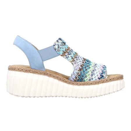 69172-91The Rieker women's sandals in blue are a modern and stylish choice for warm days. Made from high-quality fabric and synthetic materials, they ensure comfort and breathability. The design features an open heel and a round, open toe, providing a relaxed fit. A stable 5.5 cm wedge heel and platform offer excellent support and a confident stride. The 69172-91 model is a fresh addition to the SPRING-SUMMER 2025 collection, perfect for women who value both fashion and comfort.
