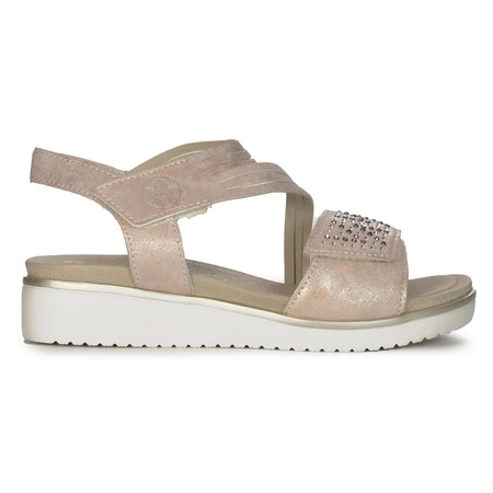 V3764-90Introducing beautiful women's sandals by Rieker, which are sure to please you. The upper is made of high-quality pink synthethic, while the inside is made of pleasant-to-touch fabric for maximum wearing comfort. The natural leather insole guarantees softness and comfort, so you can enjoy them all day long. The white plastic sole is placed on a 4-cm platform in the heel, which adds to their elegance and makes your silhouette look even more beautiful. This sandal is designed with comfort in mind, so the Velcro closure makes it quick and easy to put on and fit your foot. Choose Rieker to feel special in any situation.