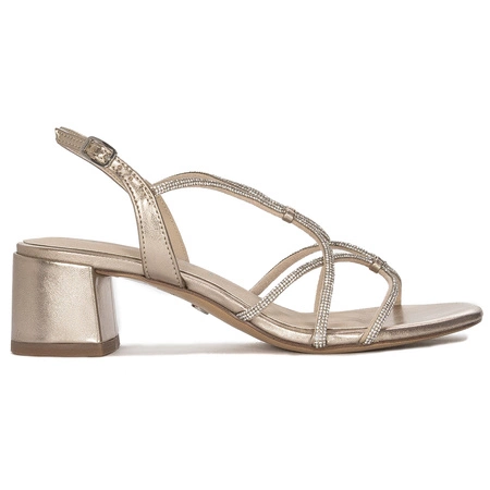 1-28236-42 933These elegant sandals are the perfect choice for women who value style, comfort and high quality. The top of the shoes is made of high-quality material and has been decorated with beautiful crystals shining in color from the same material, which gives the shoes an elegant and fashionable look. The interior of the sandals is made of comfortable fabric and plastic, which ensures maximum wearing comfort throughout the day. The insert is made of a leather-like material, which provides additional comfort and allows you to move freely. The sole of the shoe is made of high-quality material, which guarantees not only comfort, but also durability and stability while walking. The sandals have a 5.5-centimeter heel that adds a feminine and elegant line to the silhouette. The shoes are fastened with a buckle, which allows for a precise fit to the foot and increases the comfort of use. This model of sandals is perfect for evening outings, work or other occasions when you want to look stylish and elegant. These women's gold Tamaris sandals combine high-quality, fashionable design and comfort, making them the perfect addition to your summer wardrobe. They will certainly attract attention and add shine and elegance to your style.