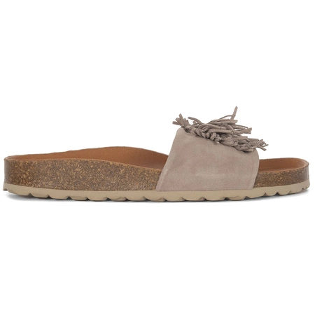 REINA VELOUR PIEDRAVerbenas Women's Sliders Reina Velour Piedra are the perfect choice for women who value comfort and stylish design. Made from high-quality natural velour leather in a subtle beige Piedra shade, these sliders combine elegance with comfort. The 2 cm platform sole, made from high-quality material, ensures stability and light cushioning with each step. The slip-on style provides easy wear, and the open toe and heel offer breathability, perfect for warmer days. The interior and insole are made from natural leather, enhancing comfort and durability. 100% made in Spain, these sliders are a great addition to your spring and summer outfits.