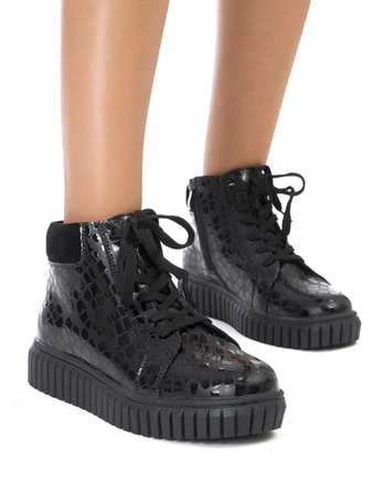 Remonte Botki damskie skórzane lakierowane ocieplane Black