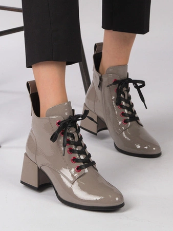 S.Barski Botki damskie na słupku sznurowane lakierowane ciepły popiel taupe