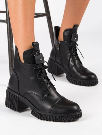 S.Barski Botki damskie na słupku sznurowane lakierowane czarne