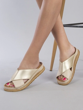 Maciejka Klapki Damskie Skórzane Beż + Złoto