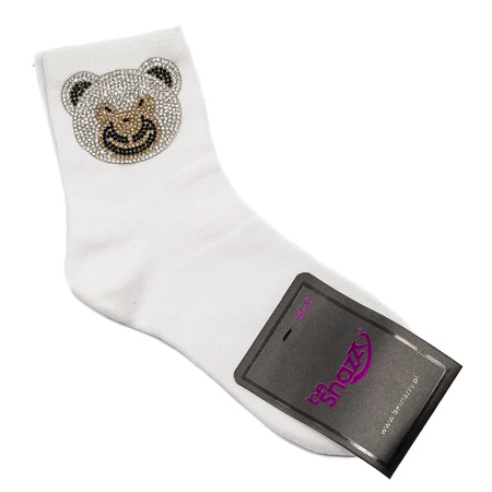 Be Snazzy SK-52 Białe Głowa MisiaDziecięce skarpetki polskiej marki Be Snazzy w kolorze białym ze wzorem: Głowa Misia wykonanym z kryształków na ściągaczu. Skarpetki wykonano z rozciągliwego materiału. Idealne na prezent dla naszych milusińskich na różne okazje. Skład materiałowy: 73% bawełna, 23% poliamid, 4% elastan.
