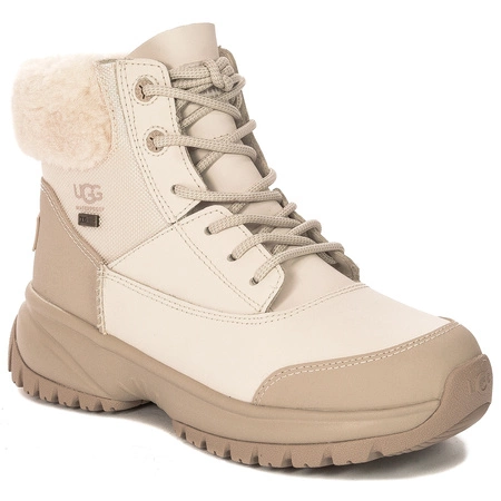 1130901 WHPModnie i wygodnie! Właśnie to oferują Ci botki z nowej kolekcji UGG Australia. Starannie wykonana cholewka ze skóry naturalnej, skóry ekologicznej oraz tkaniny w kolorze beżowym "White Pine" przyjemnie układa się na nodze. Wnętrze ocieplone polarem, a wkładka to wełna owcza. Elastyczność oraz lekkość zapewnia pianka EVA. Wytrzymała podeszwa ma wysokość 3 cm z przodu oraz 4,5 cm w obcasie gwarantuje bardzo dobrą przyczepność i amortyzację. Innowacyjna technologia Water Proof zapewnia wodoodporność. Botki posiadają sznurowadła. Bardzo lekkie, wygodne i zapewniające ciepło w mroźne, zimowe dni.