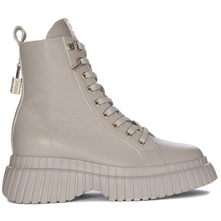 4517-505-000Prezentujemy damskie botki marki CheBello. Klasyczne, bardzo kobiece i niezwykle piękne. Mimo swej zabudowanej cholewki za kostkę są niezwykle lekkie. Miękka, delikatna cholewka to w całości skóra naturalna licowa w kolorze beżowym. Ozdobą są złote kłódki z cyrkoniami, które można również zdjąć, dzięki załączonym kluczykom. Wnętrze botków ocieplone miękkim polarem podnosi komfort noszenia. Podeszwa to platforma o wysokości 6 cm w miejscu obcasa i 4 cm z przodu. Model z okrągłym noskiem, zapinany na zamek i wiązany na sznurowadła. Dodaj swojej stylizacji charakteru z tymi botkami!!!