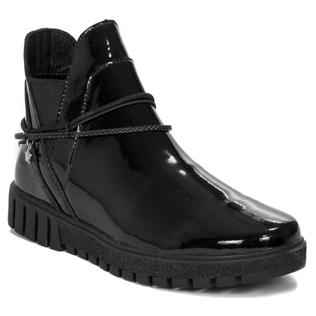 Botki marki Filippo to obuwie doskonałe na jesienne dni, które świetnie uzupełni nasz codzienny look. Cholewka z motywem gada w kolorze czarnym została wykonana ze skóry naturalnej lakierowanej. Wnętrze jak i wkładka zostały pokryte miękkim i przyjemnym w dotyku polarem, która ma zapewnić naszym stopom optymalną temperaturę w zimowe dni. Gumowe wstawki, oprócz tego że są ciekawą ozdobą to dodatkowo ułatwiają zmianę obuwia. Podeszwa to platforma w formie klina wykonana z wysokogatunkowego tworzywa jest dobrze wyprofilowana i wygodna. Całość detali składa się na wyjątkowy model buta, który idealnie dopełni wiele naszych stylizacji. Jeżeli jeszcze nie posiadasz takiego modelu w swojej garderobie nie zwlekaj z zakupem i zamów już dziś:)