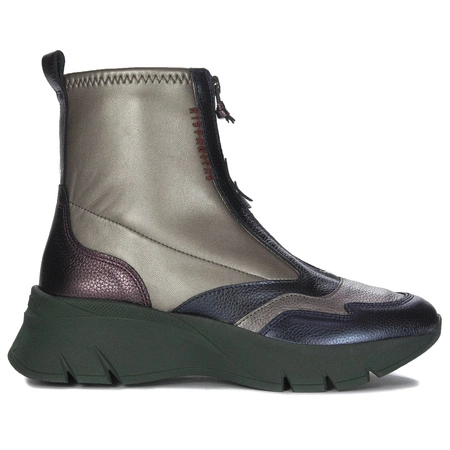 CHI243628 C003Oryginalne botki damskie znanej marki Hispanitas, to absoluty must have w szafie każdej wyróżniającej się kobiety. Ich oryginalny design idealnie wpasowuje się w dzisiejsze kanony mody. Model wykonany został z połączenia elastycznego streczu i naturalnej skóry licowej wielokolorowej z przewagą koloru złotego. Cholewka z przodu zapina jest na długi suwak. Takie rozwiązanie jest niezwykle pomocne przy zmianie obuwia. Wnętrze buta wykonane jest ze skóry oraz ociepliny, a wkładka to skóra ekologiczna. Model na podeszwie typu platforma o wysokości 5 cm w miejscu obcasa oraz 3 cm z przodu. Okrągły nosek dodatkowo poprawia komfort palców. Wyprodukowano w Hiszpanii.