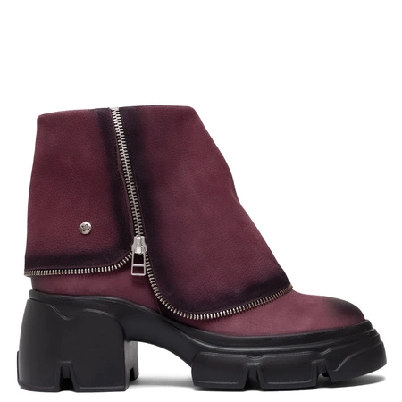 07145-23/00-8Czujesz, że Twoim jesienno-zimowym stylizacjom brakuje „tego czegoś”? Oto model, który przyciąga spojrzenia z daleka: bordowe botki Maciejka z naturalnej skóry welurowej, na masywnej platformie i stabilnym klocku. Charakterystyczny, asymetryczny panel z dekoracyjnym zamkiem oplata cholewkę niczym designerska peleryna, dodając całości nowoczesnego, odważnego charakteru. Okrągły, zamknięty nosek wysmukla stopę, a wysoka, 14-centymetrowa cholewka miękko otula kostkę. Zamek błyskawiczny ułatwia szybkie zakładanie, a geometryczna podeszwa nadaje botkom modowego pazura i świetną amortyzację podczas chodzenia.
