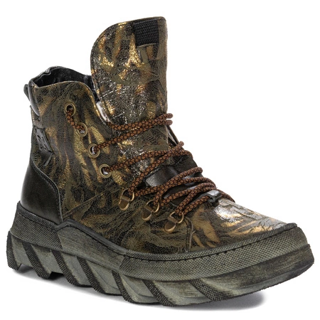 06146-25/00-4Najnowszy model skórzanych botków damskich od polskiej marki Maciejka, osadzony na płaskiej platformie. Cholewka, wykonana jest z naturalnej welurowej skóry w kolorze zielono - złotym. Wnętrze i wkładka botków zostało ocieplone przyjemnym kożuszkiem syntetycznym, co zapewnia komfort noszenia. Zamek po wewnętrznej stronie ułatwia szybkie zakładanie, a sznurowadła pozwalają na idealne dopasowanie cholewki do stopy. Podeszwa z wysokiej jakości tworzywa doskonale chroni przed chłodem, co sprawia, że buty są idealne na jesień i zimę. Okrągły nosek zapewnia wygodę dla palców, a całość wyróżnia się nowoczesnym, oryginalnym designem oraz wyjątkową wygodą. Jakość: I.